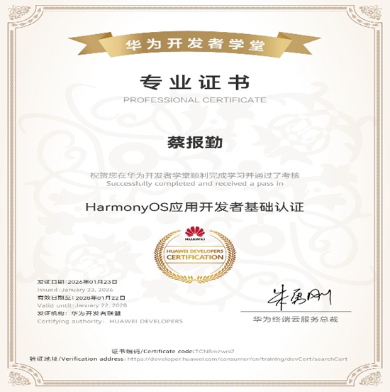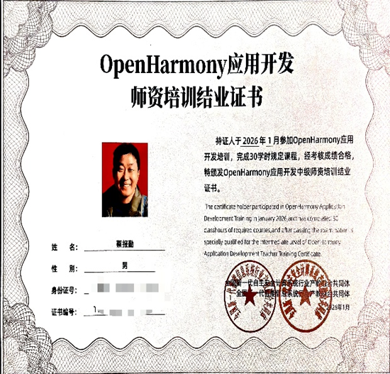为深入推进开源鸿蒙技术在高校教育领域的落地与普及,切实提升高校教师的技术应用能力和教学实践水平,2026 年 1 月 21 日至 23 日,由开放原子开源基金会主导的 “2026 开放原子校源行师资培训(湖南站)暨全国开源鸿蒙技术应用开发寒假师资培训” 在湖南信息职业技术学院顺利举办。计算机与大数据科学学院蔡报勤老师受邀参加本次专项培训,顺利通过考核并取得华为相关技术认证。